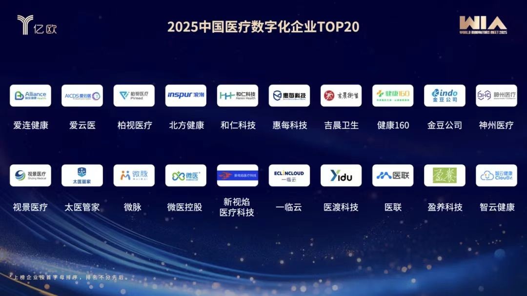 由中国领先的产业科技创新智库亿欧倾力打造的世界创新者年会,已成为中国科技领域最具影响力、最具风向标意义的盛会之一。基于对各行业的深刻洞察,每年WIM从中国及海外各行业上千家候选企业中,筛选出最具开创精神的企业并设立“世界创新奖(WIA)”系列榜单,以表彰其在领域内不懈的创新精神和杰出发展成绩。此次入选2025中国医疗数字化企业卓越榜TOP20,正是行业对北方健康推动健康医疗数据价值释放、赋能医疗卫生数智化发展综合能力与创新实践的权威认可。
